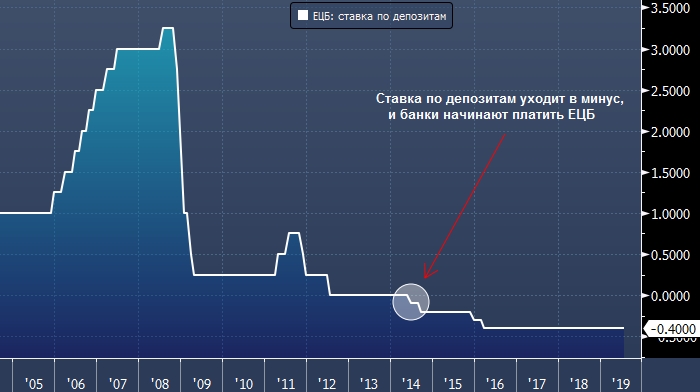 Резкое снижение кратко- и долгосрочных ставок в 2014-2016 годах привело к сокращению чистого процентного дохода европейских банков (Net interest income, NII) на 10%+. За последние пять лет, прошедшие с тех пор, как ставка по депозитам в Еврозоне ушла в отрицательную территорию (см. график ниже), европейские банки выплатили ЕЦБ 21 млрд евро, и эта цифра заметно вырастет, если регулятор продолжит снижать ставки.