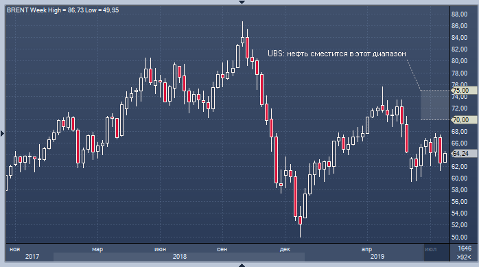 Аналитики UBS ожидают, что цена нефти марки брент в течение следующих трёх месяцев вернётся к уровням в области $70 — $75. Инвесторы на финансовых рынках нередко впадают из крайности в крайность, и в UBS полагают, что это случилось и на этот раз. Проблемы с добычей в Венесуэле, её сокращение в Иране или же гражданская война в Ливии — всё это позабылось, а участники рынка нефти зациклились на теме глобального экономического спада и рисках слабого роста спроса на энергоносители. На этом фоне даже напряженная ситуация в Ормузском проливе даёт нефти весьма ограниченную поддержку.
