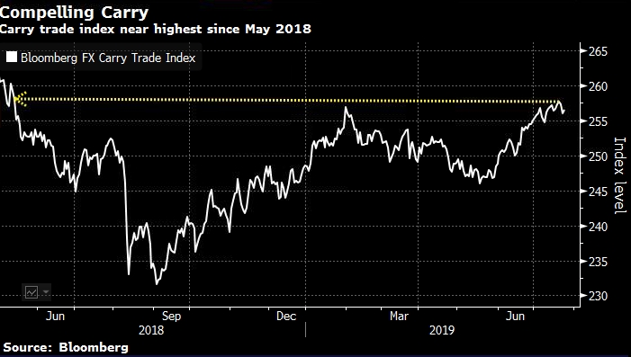 Поскольку настроенные на смягчение монетарной политики центральные банки повышают объем совокупного долга с отрицательной доходность во всех развитых странах, для жаждущих доходности инвесторов становится все более заманчивым брать займы в долларах США и евро для покупки более рискованных валют развивающихся стран. Покупка таких активов за доллары приносит лучшую доходность с мая 2018 года, по данным разработанного Bloomberg индекса, который отслеживает так называемые перенос прибыли с восьми развивающихся рынков, финансируемых за счет коротких позиций в долларе. Один из примеров того, что это работает: ставки на аргентинское песо с использованием долларов в этом году приносят 15% прибыли, а с евро — 20%.