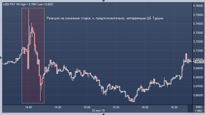 Смягчение политики оказалось значительно более агрессивным, нежели предполагало большинство участников рынка, что спровоцировало рывок USDTRY к 5.7561, однако за несколько минут всё изменилось и пара рухнула к 5.6542. Подобное изменение динамики можно было бы списать на низкую ликвидность на рынке, однако, когда пыль осела, лира продолжила расти — к настоящему времени USDTRY даже успел обновить минимумы и достиг отметки в 5.6521.