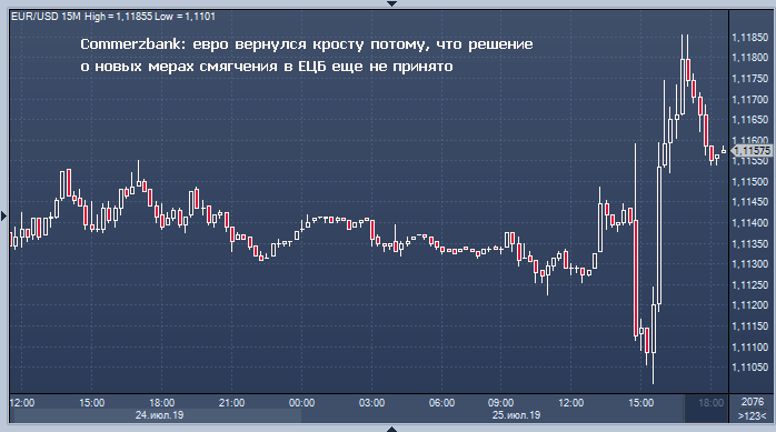 По словам Эстер Райхельт, валютного стратега из Commerzbank, евро отыграл первоначальные потери и вырос против доллара, поскольку президент Европейского центрального банка Марио Драги не дал рынкам того «голубиного» сигнала, на который они надеялись. Похоже, что рынок «надеялся на более четкий сигнал», что меры смягчению будут введены в сентябре, сказал Райхельт.