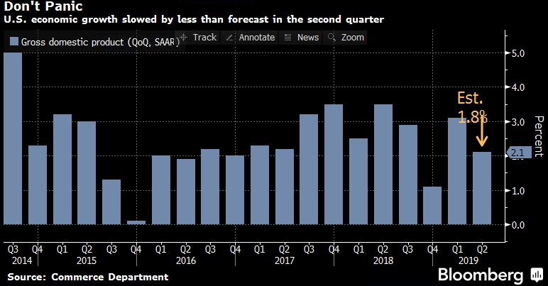 Экономический рост в США замедлился во втором квартале меньше, чем прогнозировалось, так как потребительские расходы превысили оценки, хотя более слабыебизнес-инвестиции и экспорт подчеркнули риски, побуждающие Федеральную резервную систему к снижению процентной ставки на следующей неделе.