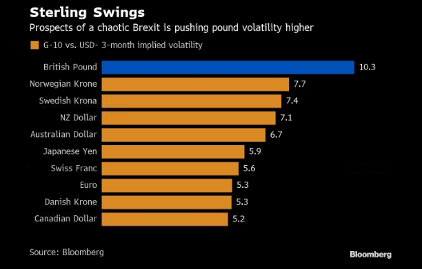 Фунт прогибаетсяиз-за опасений по поводу Brexit, и Банк Англии может оказать дополнительное давление на валюту, когда он встретится на этой неделе. Стерлинг упал на 0.8% по отношению к доллару до 1.2119 во вторник, увеличив потери после падения в понедельник на 1.3%. Стоимость страхования от волатильности в фунте в течение трехмесячного периода поднялась до самой высокой отметки среди валют Группы 10 из-за растущих опасений, чтопремьер-министр Великобритании Борис Джонсон выберет Brexit без сделки.