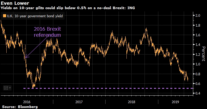 Трехмесячныйриск-разворот для пары достиг уровня 182 базисных пунктов в пользу продажи стерлинга, самого медвежьего значения с апреля. Фунт также упал по отношению к евро и иене. Тем временем облигации готовы показать ралли третий месяц к ряду, и аналитики прогнозируют дальнейший рост котировок. Доходность 10-летних государственных облигаций упала на 16 базисных пунктов до 0.65% в этом месяце и может упасть ниже 0.50% в случае жесткого Brexit, согласно Петру Крпате, главному валютному стратегу по региону EMEA в ING Bank NV.
