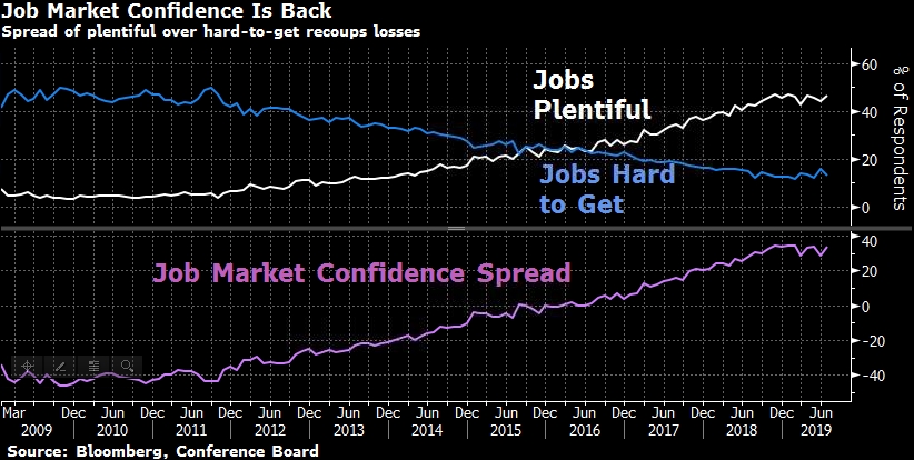 Беспокойство по поводу ослабления доверия американцев к рынку труда было напрасным. Июльский доклад от Conference Board показывает, что потребители оптимистичны почти во всем. Но главное — это рынок труда. Люди уверены в том, что смогут найти работу в будущем. Планы купить автомобиль, дом и крупную бытовую технику — все пошло вверх в этом месяце.