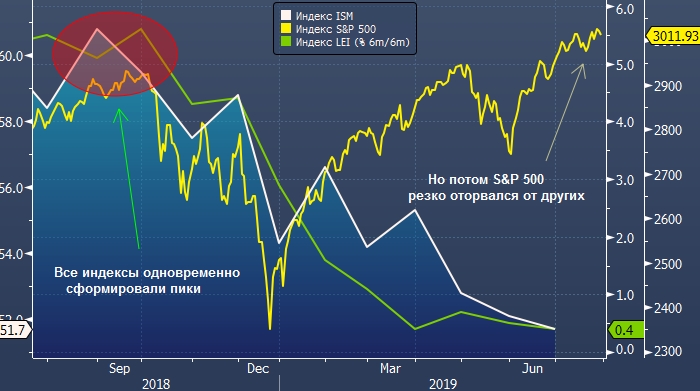 Стоит отметить, что обычно ФРС приступает к снижению ставок, когда ведущие индикаторы (LEI) снижаются уже на протяжении полугода. При этом масштаб снижения не имеет значения: ФРС начинает стимулировать, даже если экономическое замедление слабо заметно. Эти индикаторы снижаются с сентября 2018 года и к настоящему моменту их шестимесячное значение опустилось до ноля, угрожая уйти в отрицательную зону.