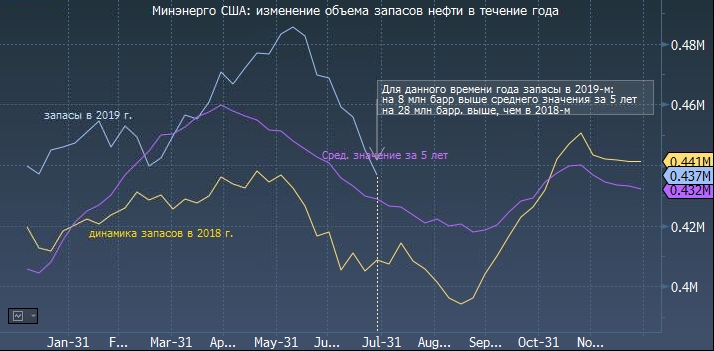 Цены на нефть никак не отреагировали на сильное сокращение запасов нефти, согласно официальному отчету Минэнерго. Причем данные показали более резкое сокращение не только в сравнении с прогнозами аналитиков, но в сравнении со вчерашним отчетом Американского института нефти (API). Последние выявили падение запасов сырой нефти на 6.02 млн. баррелей. Отсутствие реакции вполне объяснимо в свете оглашения через несколько часов решения ФРС о снижении ставки на 25 пунктов. Если американский ЦБ даст сигнал к новому снижению ставок в этом году, помимо сегодняшнего, что пока маловероятно, цены на нефть выстрелят. В нашем базовом сценарии этого не произойдет, цены на сырье упадут.
