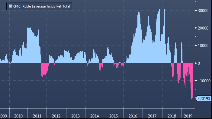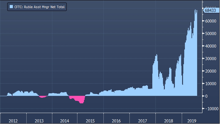 Аналогичным образом длинная позиция по рублю управляющих фондами (которая традиционно противоположна позиции спекулянтов, использующих для торговли заемные средства) увеличилась на 1 960 до 68 433 контрактов. Это в свою очередь всего на 616 контрактов меньше рекордного максимума, установленного на той же июльской неделе.