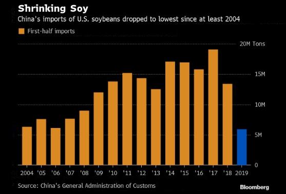 Китай уже резко сократил закупки в США в течение первой половины этого года благодаря падению импорта сои до самого низкого уровня за десятилетие. В знак доброй воли азиатский сельскохозяйственный гигант недавно дал поручение пяти компаниям купить до 3 миллионов тонн соевых бобов в США без уплаты ответных импортных тарифов. Между тем, государственные компании имели возможность купить около 14 миллионов тонн, из которых около 4 миллионов тонн еще не было отгружено.