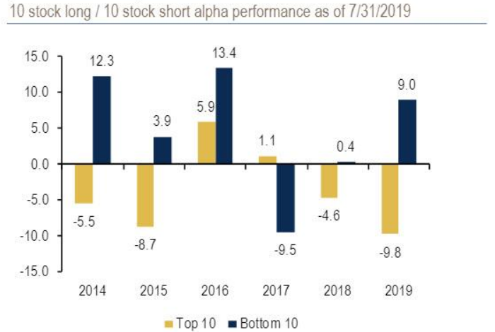 Покупка наиболее «ненавидимых»* акций, плюс продажа наиболее популярных* стала наиболее прибыльной торговой стратегией на рынке акций США последних шести лет, за исключением низковолатильного 2017 года. Более того, в этом году динамика 10 наиболее популярных акций оказалась на целых 19% хуже динамики наиболее ненавидимых, что стало пятилетним рекордом.