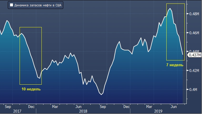 Данные Минэнерго США на этой неделе покажут, что коммерческие запасы нефти за отчетную неделю до 2 августа снизятся на 3 млн баррелей. Таков средний прогноз 7 экспертов, опрошенных агентством Bloomberg на момент написания статьи. При этом 6 экспертов пророчат снижение запасов и только один прогнозирует увеличение. Если консенсус-прогноз совпадет с фактическими цифрами, то это будет 8-я неделя подряд, когда запасы сокращаются. В декабре 2017 года была зарегистрирована 10-недельная серия снижения запасов. Ведомство опубликует свою еженедельную статистику по изменению запасов нефти и нефтепродуктов в среду 7 августа в 17:30 мск.