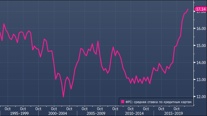 Комитет по операциям на открытом рынке Федеральной резервной системы (ФРС) США на прошлой неделе снизил целевой диапазон ставки по федеральным фондам на 25 базисных пункта до 2.00% — 2.25%, однако рядовым американцам это вряд ли чем то поможет. Данные Федерального резервного банка Сент-Луиса свидетельствуют о том, что средняя ставка по кредитным картам в США в мае достигла 17%, что является максимальным показателем за последние 25 лет. Тем временем, еженедельные данные Creditcards.com, основывающиеся на опросе 100 эмитентов карт в США, говорят о том, что в конце июля средний уровень ставки по картам достиг 17.8%. Стоит отметить, что при таких ставках объем долга по картам в США достиг рекордных $850 млрд.