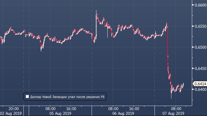 Новозеландский доллар упал на 2.3% до 63.78 цента США, а доходность двухлетних облигаций страны упала на 20 базисных пунктов до рекордных 0.765% вслед за решением центрального банка снизить ставку сильнее, чем ожидалось — на половину процента.
