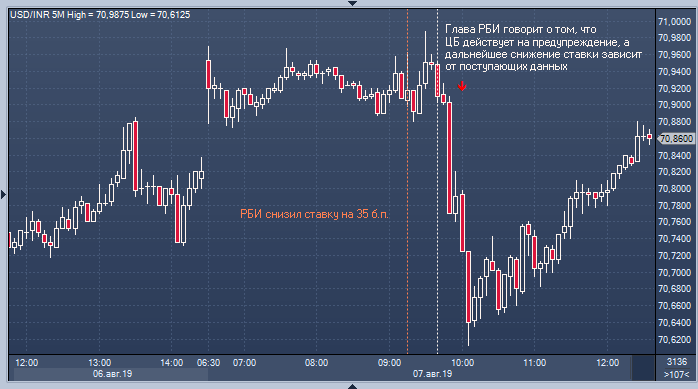 Чуть позднее Резервный Банк Индии (РБИ) последовал его примеру и снизил ключевую ставку на 35 базисных пункта, тогда как ожидалось снижение лишь на 25 б.п. Снижение ставки РБИ стало четвертым за год и теперь она составляет 5.40%, что является минимальным значением с 2010 года. USDINR на фоне решения регулятора попытался прорвать офера вблизи 71.00, однако быкам это не удалось, а свидетельства раскола в рядах руководства (4 члена комитета по денежно-кредитной политике проголосовали за снижение ставки на 35 б.п., а 2 — за снижение на 25 б.п.) и отсутствие выраженных мягких комментариев со стороны главы РБИ дали повод для фиксации прибыли по коротким позициям в рупии. Впрочем, к настоящему времени быки вновь активизировались: интерес к покупкам на спадах сохраняется, а техническая картина в USDINR, в частности слом линии сопротивления с октября 2018 и формирование двойного основания, говорит в пользу роста курса в направлении 72 рупий за доллар.