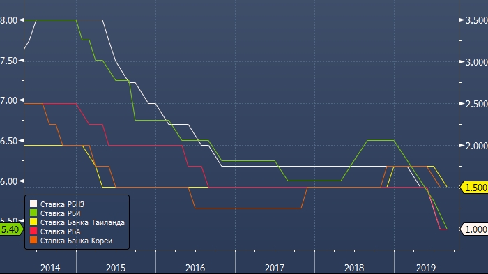 Резервный Банк Новой Зеландии сегодня снизил ставку сразу на 50 базисных пункта, что оказалось выше 25 б.п., которых ожидал рынок и стало катализатором падения курса киви. Однако в одиночестве он не остался.