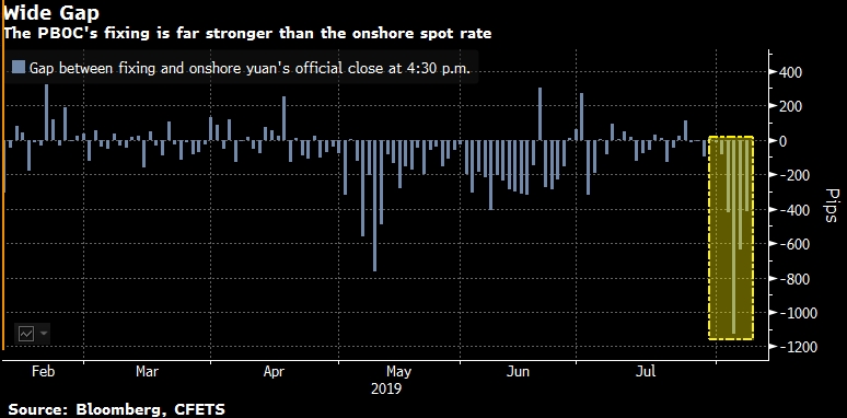 В то время как юань преодолел ключевой уровень 7 на этой неделе, впервые с мая 2008 года, фиксированный курс ЦБ остался ниже (для доллара). На карту поставлен риск того, что рынки в четверг увидят референтную ставку в качестве сигнала будущей политики, так как череда фиксаций на более слабой стороне 7 может усугубить опасения по поводу дальнейшей девальвации юаня и бегства капитала. Центральный банк уже предпринял некоторые шаги на этой неделе, чтобы ограничить снижение после того, как юань продемонстрировал мощнейшее за четыре года падение, включая заверение иностранных компаний, что валюта не ослабнет значительно.