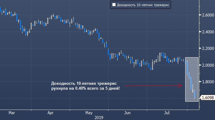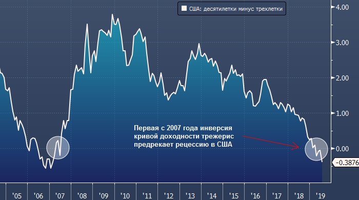 По его оценкам, вероятность рецессии в США в ближайшие 12 месяцев все еще составляет меньше 50%, а вот инвесторы в этом не так уверены. Доходность 10-летних трежерис за два с половиной дня рухнула на 0.30%, а кривая доходности облигаций Казначейства США впервые с 2007 года вошла в стадию инверсии (ProFinance.ru: доходность трехлеток оказалась выше, чем у десятилеток).