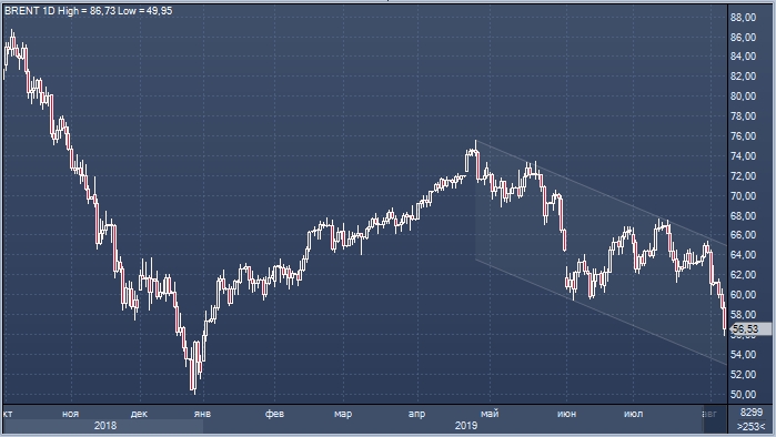 Цены на Brent с прошлой недели упали более чем на 12% на фоне обвала мировых фондовых индексов после заявления Дональда Трампа о введении с 1 сентября 10-процентной пошлины на китайский импорт в США в объеме $300 млрд.
