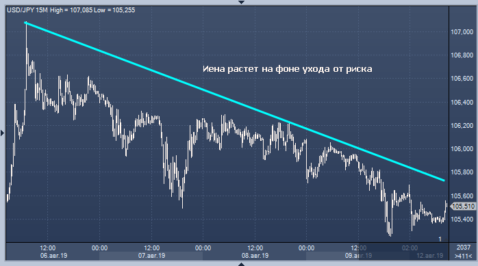 Иена растет против валют Группы 10, поскольку уход от риска задавал тон в Азии. С открытием Европы доллар также начал проявлять характеристики защитного и доходного актива. Торговая напряженность задавала направление торгам на фоне низких объемов торгов, поскольку большинство рынков в Азии были закрыты на выходные. USD/JPY падает четвертый день, так как президент США Дональд Трамп заявил, что торговые переговоры с Китаем могут не состояться в сентябре, как планировалось ранее. Пара снизилась на 0.4% до 105.32. Большие опционы истекают в понедельник на уровне 105.00 (1.6 млрд долларов) и 105.50 (1.5 млрд долларов): DTCC.