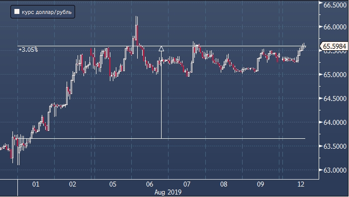 Курс доллара по отношению к рублю на торгах в понедельник, 12 августа, предпринимает попытки продолжения роста. Котировки в паре USDRUB сформировали локальный максимум 65.66. С начала августа российская валюта подешевела на 3%, но пока остается ниже максимума 6 августа на уровне 66.22 за доллар. Этот экстремум на 1 копейку ниже летнего пика, сформированного 2 июня на 66.23.