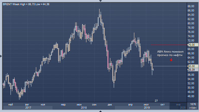 В ABN Amro понизили прогноз по цене нефти марки брент на конец 2019 с $70 до $60 за баррель, а по нефти WTI — с $60 до $55. В банке отмечают болезненную реакцию рынка на эскалацию торговой войны США и Китая, и констатируют, что перспективы компромисса выглядят все более призрачными. Аналитики считают, что конфликт рискует принять затяжной характер, и в полной мере его негативный эффект еще предстоит ощутить. В то же время производители при текущих уровнях цен чувствуют себя вполне комфортно и имеют стимул к наращиванию добычи. Пока мысли участников рынка заняты ростом производства нефти вне ОПЕК, не стоит думать, что участники соглашения ОПЕК+ склонны к самопожертвованию во благо конкурентов. В ABN Amro отмечают, что слабость спроса в условиях более устойчивого роста предложения даёт повод ожидать сохранения подавленного настроя на рынке нефти в течение более длительного периода времени в 2020 и 2021 годах.
