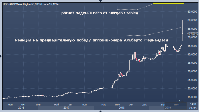 Аргентинский песо вчера в моменте терял 37%, пережив очередной этап девальвации. Причина — поражение поддерживающего бизнес президента Аргентины Маурисио Макри, что может свидетельствовать о грядущих проблемах для активов этой латиноамериканской страны. Предварительную победу одержал оппозиционный кандидат Альберто Фернандес.
