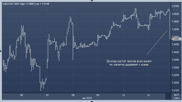 На лентах новостей появились сообщения о том, что Китай проведет телефонные переговоры с США накануне 1 сентября, т. е. дня, когда Дональд Трамп обещал повысить пошлины на китайские товары на сумму $300 млрд. Эти новости, а также неожиданно сильные данные по инфляции в США спровоцировали сокращение доходности 2-летних трежерис относительно 10-летних до минимальных значений с 2007 года.
