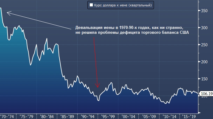 Японцы уступили, и курс доллара к иене снизился с 360 в 1971 году до 80 в 1995. Однако резкая девальвация японской валюты не помогла США решить проблему дефицита своего торгового баланса. К 1991 году на Японию не только приходилось 60% этого показателя, но из-за девальвации иены страна оказалась затянутой в дефляционное болото.