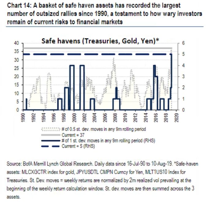 В этом месяце начался набег на активы тихой гаванииз-за всколыхнувших инвесторов индикаторов рецессии, разногласий между торговыми партнерами и разочарований в данных — все на фоне низкой августовской ликвидности. Золото выросло примерно на 18% в этом году, в то время как иена является лидером по отношению к доллару в валютах G-10. Bank of America Corp измеряют совокупное количество экстремальных движений среди корзины традиционныхактивов-убежищ в течение девятимесячных периодов.