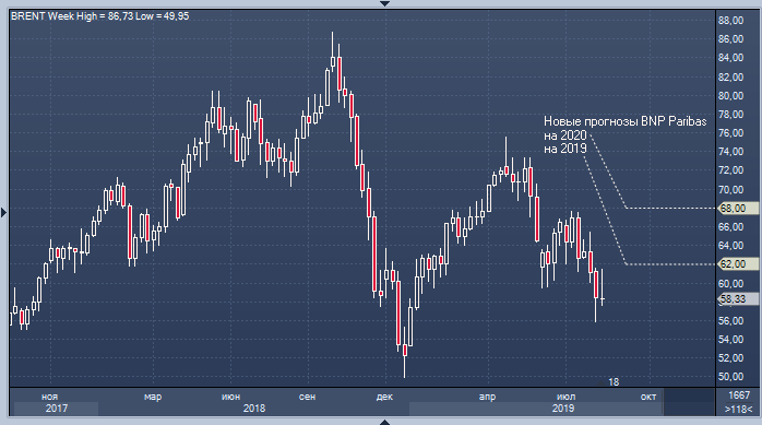 Банк понизил прогноз по нефти марки брент на конец этого года с $71 до $62 и с $82 до $68 — на конец 2020. Прогнозы по WTI были снижены с $63 до $55 и с $64 до $51 за баррель соответственно.