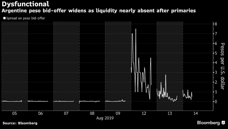 Дело даже не в том, чтобы обратить внимание на потенциальный риск того, что популист окажется в Casa Rosada, а в том, чтобы обратить внимание на то, что может случиться, когда подобныериск-события встречаются с неликвидными рынками. Посмотрите на аргентинскую валюту. Разрыв между ценами покупки и продажи в понедельник вырос до 7 песо за доллар. На долю центрального банка и казначейства страны приходилось около трети объема спотового рынка. Даже при том что валюта упала более чем на 20% с прошлой пятницы, похоже, трейдерам еще предстоит распродавать основную часть их активов.