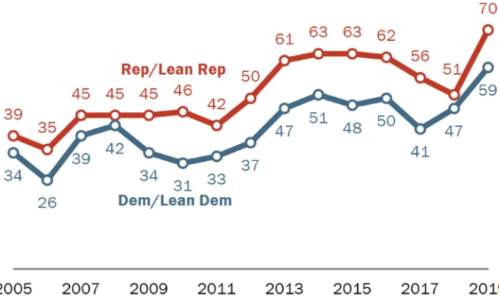 14 лет назад лишь 29% американцев думали о Китае плохо. Теперь же 24% из них не просто изменили свое мнение, но считают Поднебесную серьезной угрозой. Хуже всего относятся к Китаю сторонники Республиканской партии (70%, см. график ниже), а в целом по стране любителей Поднебесной насчитывается всего 26%, хотя два года назад их было больше 40%.