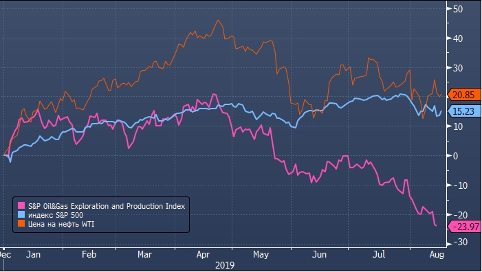 Цены на нефть по состоянию на вечер пятницы 16 августа выросли с начала года на 20.7%. Индекс широкого рынка S&P 500 в тот же момент демонстрирует рост с начала января на 15.2%. Однако отраслевой индекс S&P Oil&Gas Exploration and Production с начала 2019 г. снизился на 24%.
