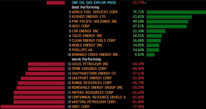 Одним из главных аутсайдеров среди 63 компаний индекса являются Unit Corp и Whiting Petroleum Corp. Последняя в прошлом месяце уволила треть своей рабочей силы, неожиданно объявив об убытках по итогам 2 квартала текущего года. Прогнозы роста также были сокращены по итогам первого полугодия.
