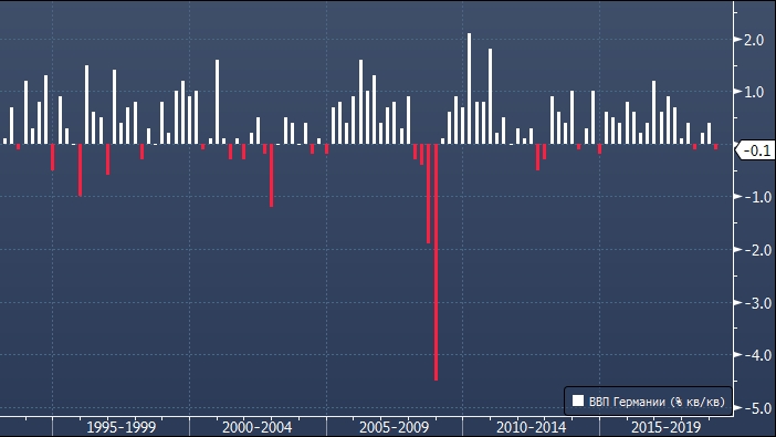 Центральный банк Германии констатировал высокую вероятность того, что в третьем квартале 2019 года в немецкой экономике может начаться рецессия. Во втором квартале ВВП потерял 0.1%, и в Бундесбанке ожидают, что темпы сокращения останутся скромными, однако оптимизма инвесторам это не добавляет.