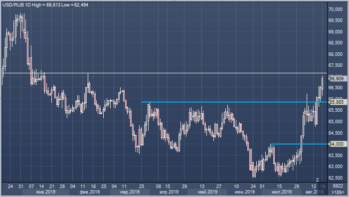 Курс доллара к российской валюте в понедельник 19 августа вырос до 67.02. Это наихудший курс рубля с 14 февраля (за последние 5 месяцев).