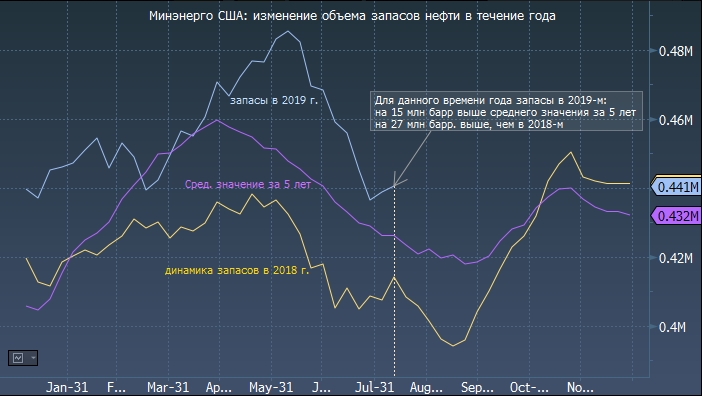 Данные Минэнерго США на этой неделе покажут, что коммерческие запасы нефти за отчетную неделю до 16 августа снизятся на 1.2 млн баррелей. Таков средний прогноз 8 экспертов, опрошенных агентством Bloomberg на момент написания статьи. При этом 6 экспертов пророчат снижение запасов и двое прогнозируют увеличение.