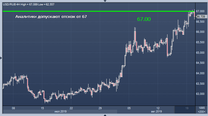 Уровень 67 рублей за доллар после четырех дней уверенного роста «вряд ли будет пройден с первого подхода, так что с технической точки зрения более вероятен отскок как минимум в район 66.5 руб.», считает аналитик БКС Брокер Игорь Галактионов. По евро техническая картина более «бычья», так как единая валюта преодолела значимое сопротивление на отметке 74 руб. и закрепилась выше. Формально, это открывает паре путь к следующим целям на уровнях 74.7 руб. и 75 руб. Нефть и грядущий налоговый период окажут поддержку рублю, равно как привлекательность российских долговых обязательств с их повышенной доходностью в свете замедления инфляции и продолжения цикла снижения ключевой ставки.