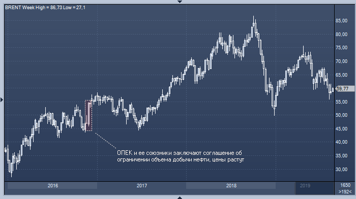 Так и случилось: в конце 2016 года страны ОПЕК и их союзники, включая Россию, заключили соглашение об ограничении объема добычи нефти, которое в несколько измененном виде действует и поныне. С конца 2016 года по вторую половину 2018 года котировки Brent выросли с $50 до $85.