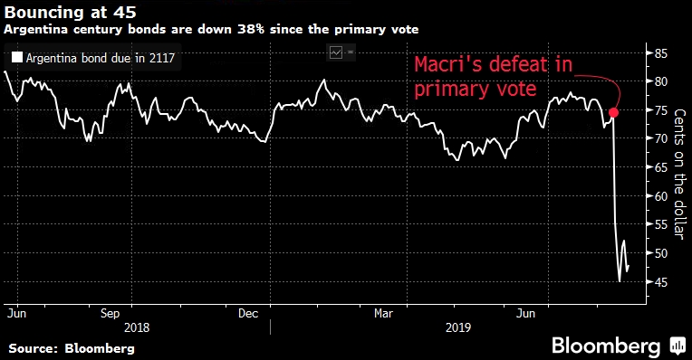 Менее чем через два года после успешного размещения Аргентиной100-летних облигаций на сумму 2.75 млрд. долл. США страна вновь столкнулась с реальностью новой возможной реструктуризации долга после ошеломительного поражения президента Маурисио Макри на предварительных выборах. Финансовые менеджеры и аналитики из таких фирм, как Citigroup Inc и Bank of America Corp, говорят, что инвесторы, вероятно, окупят менее 40 центов за доллар своих вложений, если Аргентина откажется от исполнения своих обязательств — в третий раз за два десятилетия.