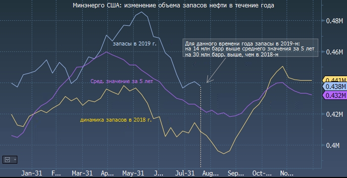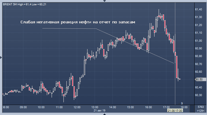 Цены на нефть снижаются после публикации официального отчета Минэнерго США по запасам. Официальные данные о снижении сырой нефти оказались бычьими относительно прогнозов аналитиков и медвежьими относительно вчерашнего отчета Американского института нефти (API), который сообщал о падении запасов нефти на 3.45 млн баррелей и которые частично были уже отыграны сегодня на рынке за счет повышения котировок. Также, можно сказать, что «отскок дохлой кошки» после распродажи прошлой недели на фоне истерии по поводу рецессии после инверсии кривых, обострения торговой войны и проблем в Аргентине, выглядел немного завышенным — даже несмотря на некоторые проблемы с предложением, вроде ухода с рынка части иранской и саудовской нефти. Пока нет никаких фундаментальных причин — пока в пятницу Центробанки не дадут явного сигнала к новому количественному смягчению — для устойчивого роста нефти.