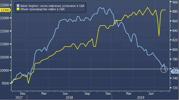 Максимум 2018 года — 888 действующих нефтяных буровых. Это пик был сформирован на неделе до 16 ноября. Абсолютный максимум количества нефтяных буровых в США был достигнут в октябре 2014 года. Тогда было зарегистрировано 1609 штук.