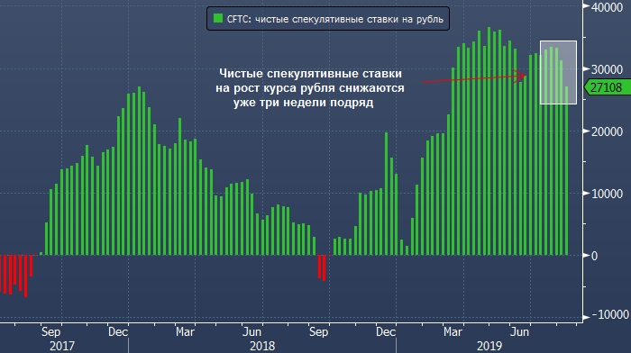 Таким образом, спекулятивный интерес к рублю снижается уже три недели подряд. По итогам пятницы рубль оказался слабейшей валютой в сегменте EM, подешевев против доллара на 0.7% на фоне обвала цен на нефть, спровоцированного эскалацией торговой войны между США и Китаем.
