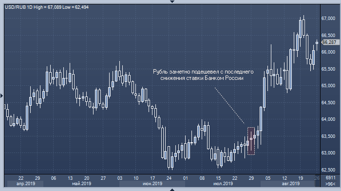 29 июля Банк России снизил ключевую ставку на 0.25% до 7.25%, и, по единодушному прогнозу экономистов, опрошенных Bloomberg, то же самое произойдет и на следующем заседании регулятора, которое намечено на 6 сентября. Впрочем, слабая динамика рубля может спровоцировать рост инфляционных ожиданий и заставить Банк России повременить с очередным смягчением денежно-кредитной политики. Рынок форвардов уже начинает закладывать в цены вероятность подобного развития событий.