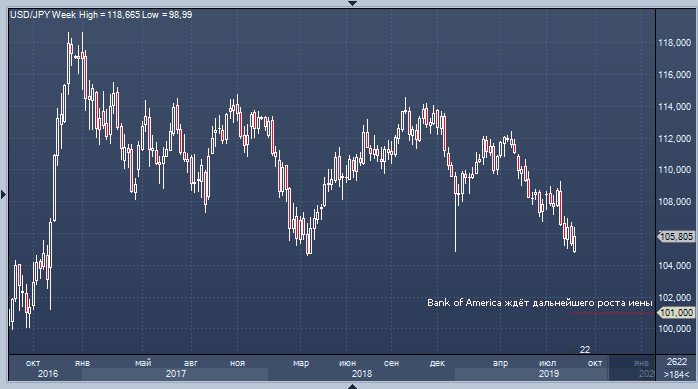 В Bank of America Merrill Lynch полагают, что снижение USDJPY обеспечит сокращение ставок ФРС и сохранение мягкой риторики, тогда как дополнительным драйвером обещает стать и рынок акций. В банке полагают, что во втором полугодии пик на нем будет окончательно сформирован и к власти придут медведи — в условиях продолжающейся торговой войны и все более ощутимого спада в мировой экономике смягчение политики ФРС вряд ли сможет обеспечить устойчивый рост аппетита к риску.