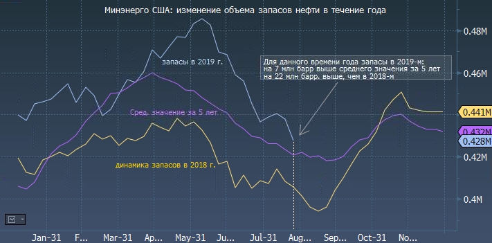Цены на нефть Brent поднялись на 20 центов после выхода отчета Минэнерго США по запасам, после чего вернулись к предновостным уровням. Несмотря на то, что падение запасов стало рекордным с июня, оно в целом соответствует сокращению, указанному во вчерашнем отчете Американского института нефти (API), а расти рынку в условиях усиления ожиданий рецессии в мировой экономике довольно трудно. Нефть сейчас очень сильно привязалась к S&P 500 как индикатору будущей рецессии. В свою очередь акции реагируют на инверсию кривых на рынке облигаций. Акции могут пострадать также после выхода негативных отчетов компаний. В общем, пока мы не видим положительной реакции нефти на сегодняшние официальные данные о сокращении запасов.