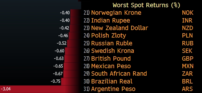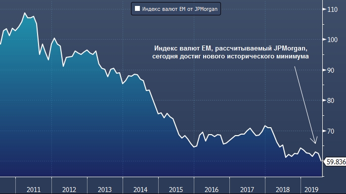 Индекс валют развивающихся стран, рассчитываемый JPMorgan, сегодня опустился до нового исторического минимума. Лидерами снижения стали разнообразные песо, от аргентинского и колумбийского до чилийского и мексиканского, а компанию им составили бразильский реал и турецкая лира. Российский рубль расположился на седьмом месте в рейтинге лидеров снижения.
