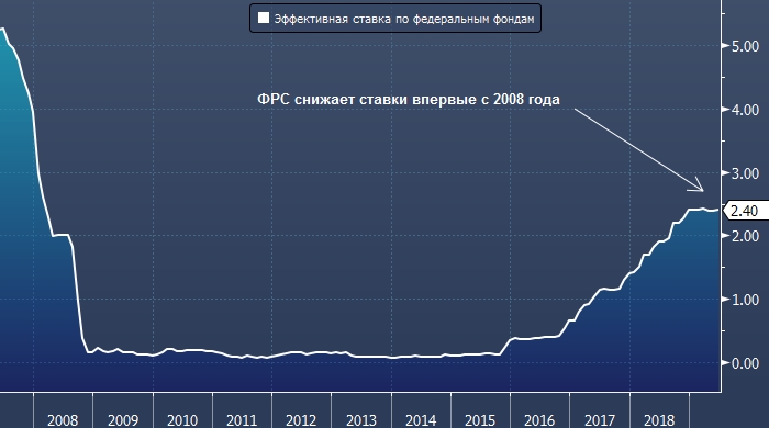 Напомним, что 31 июля ФРС снизила ставки впервые с мирового финансового кризиса 2008 года. Цикл ужесточения монетарной политики продолжался с конца 2015 года по конец 2018 года. За это время ставка по федеральным фонам выросла с 0.25% до 2.50%.