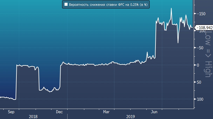 Рынок производных инструментов давно учитывает в ценах 100-процентную вероятность снижения ставок на 0.25% на сентябрьском заседании ФРС (см. график ниже). Более того, некоторые инвесторы ждут от регулятора и более агрессивных действий и учитывают в ценах 15-процентную вероятность ее снижения сразу на 0.50%.