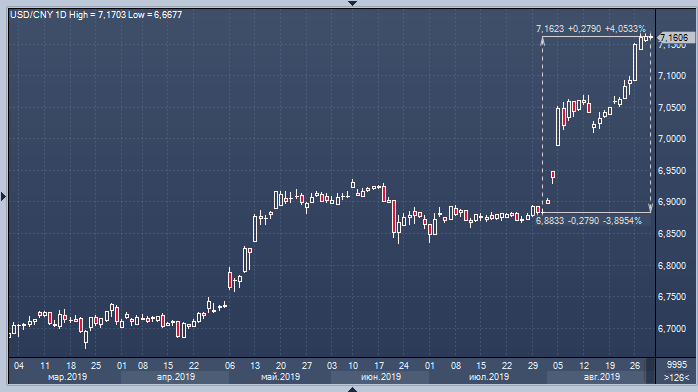 Курс доллара к юаню продолжает расти уже 11 дней подряд и сегодня установил новый долгосрочный максимум в районе 7.1703. Темпы ослабления китайской валюты замедлились, учитывая усилия Народного Банка Китая по стабилизации курса посредством фиксинга — центробанк устанавливает его выше ожиданий уже седьмой день подряд — однако настрой участников рынка остается медвежьим.